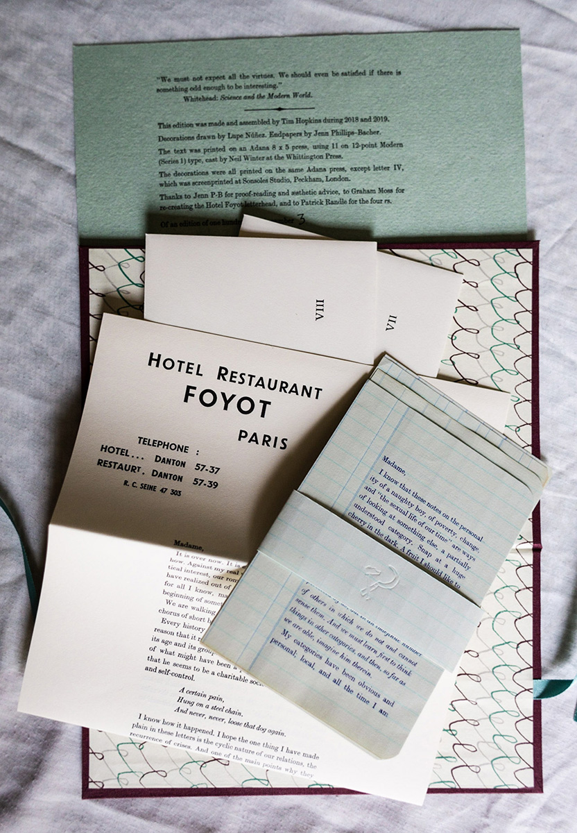 The text is in the formal Modern Number 1 type – there is no suggestion that these are “real” letters written in longhand, which would risk feeling twee or contrived. Nevertheless, the imperfections that result from printing large amounts of text on a small tabletop press (indentations in the paper, some inconsistencies in the printing) are unmistakably the product of a human hand, which further adds to the atmosphere of reading a real person’s letters.