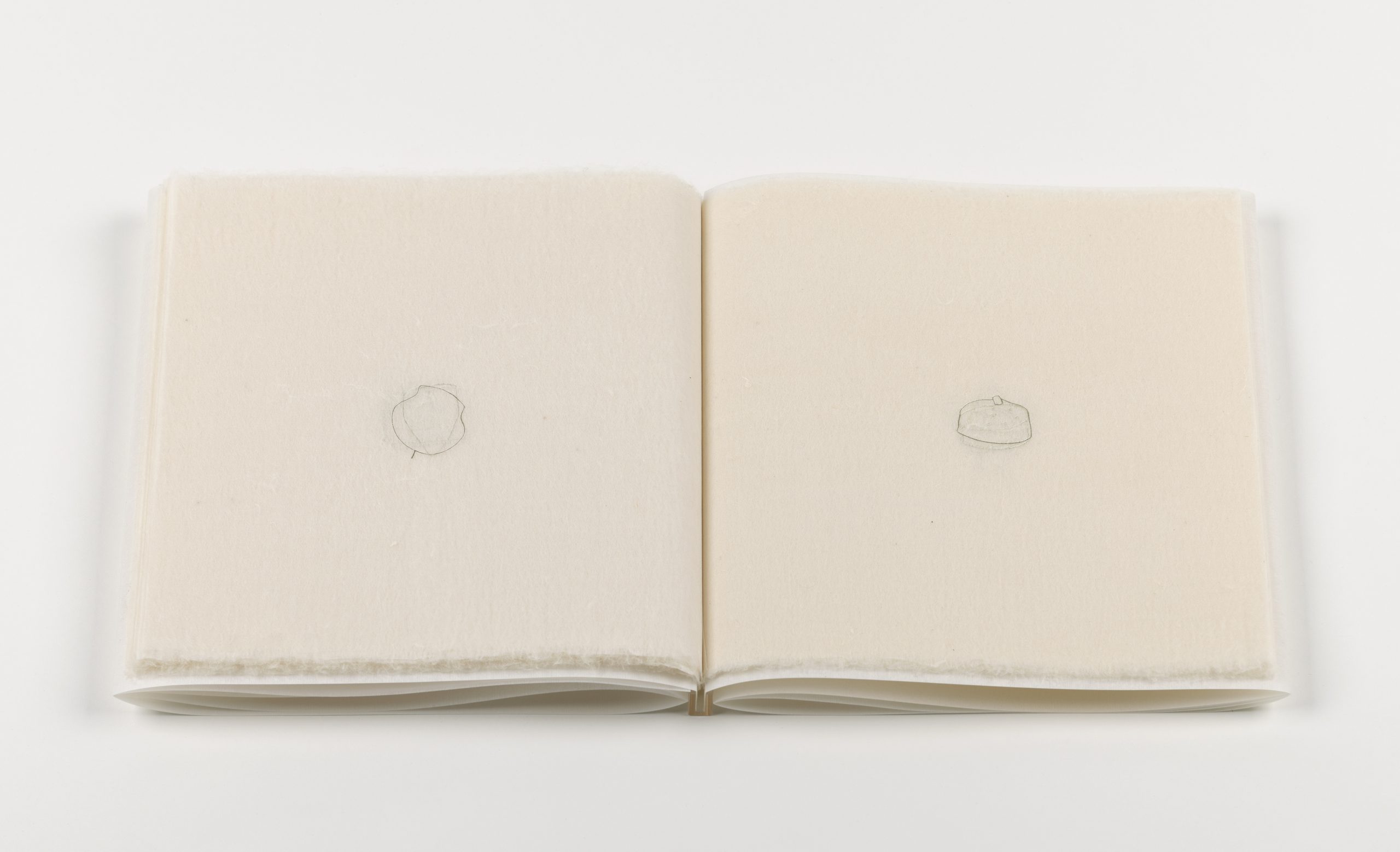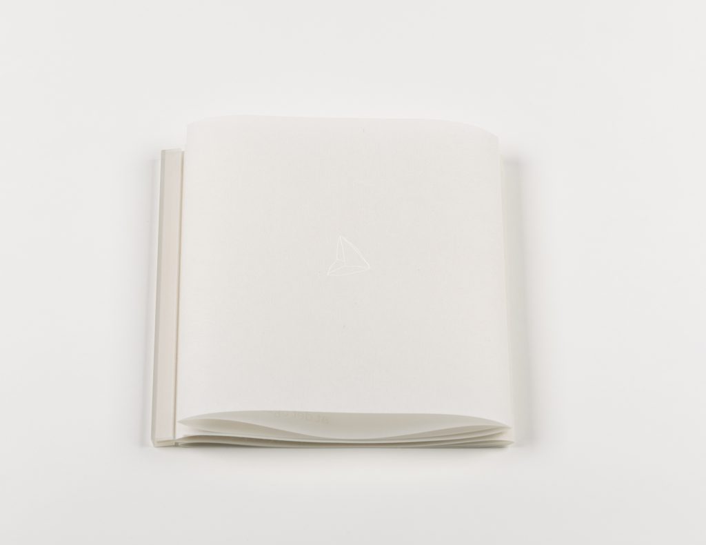 The hats are embossed on very thin Urushikoshi Japan paper, so delicate that it does not have a sealed surface but instead reveals the individual fibers. Pigment printing would not create a continuous line on this paper, but the light-gold foil printing on both sides of the page succeeds in closing the gaps, so the hats appear like glowing symbols on the fragile paper. When the pages are layered and illuminated, the viewer sees a network of lines, which only turn into independent drawings when the pages are turned.