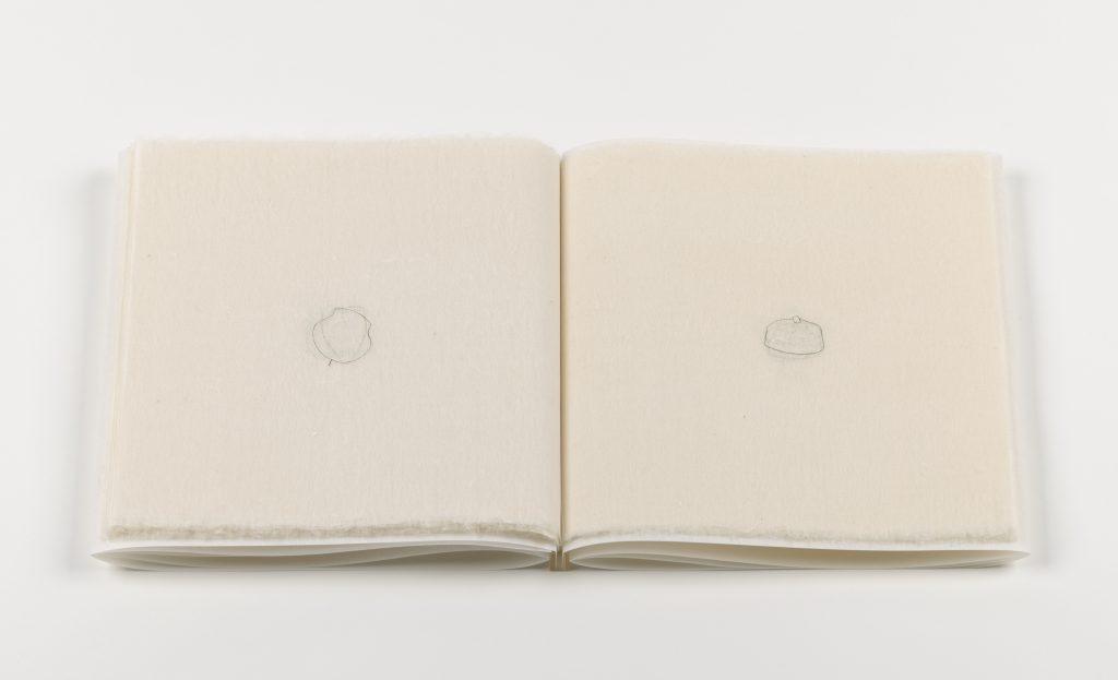 Each of the 31 drawings in this book represents a head covering worn in a religious or spiritual context; they come from various faiths around the world. Thanks to the straight-line drawings and partial rotation, the protective hats are also reminiscent of vessels, entering into a dialogue with Fosse’s “darkened boat.”
