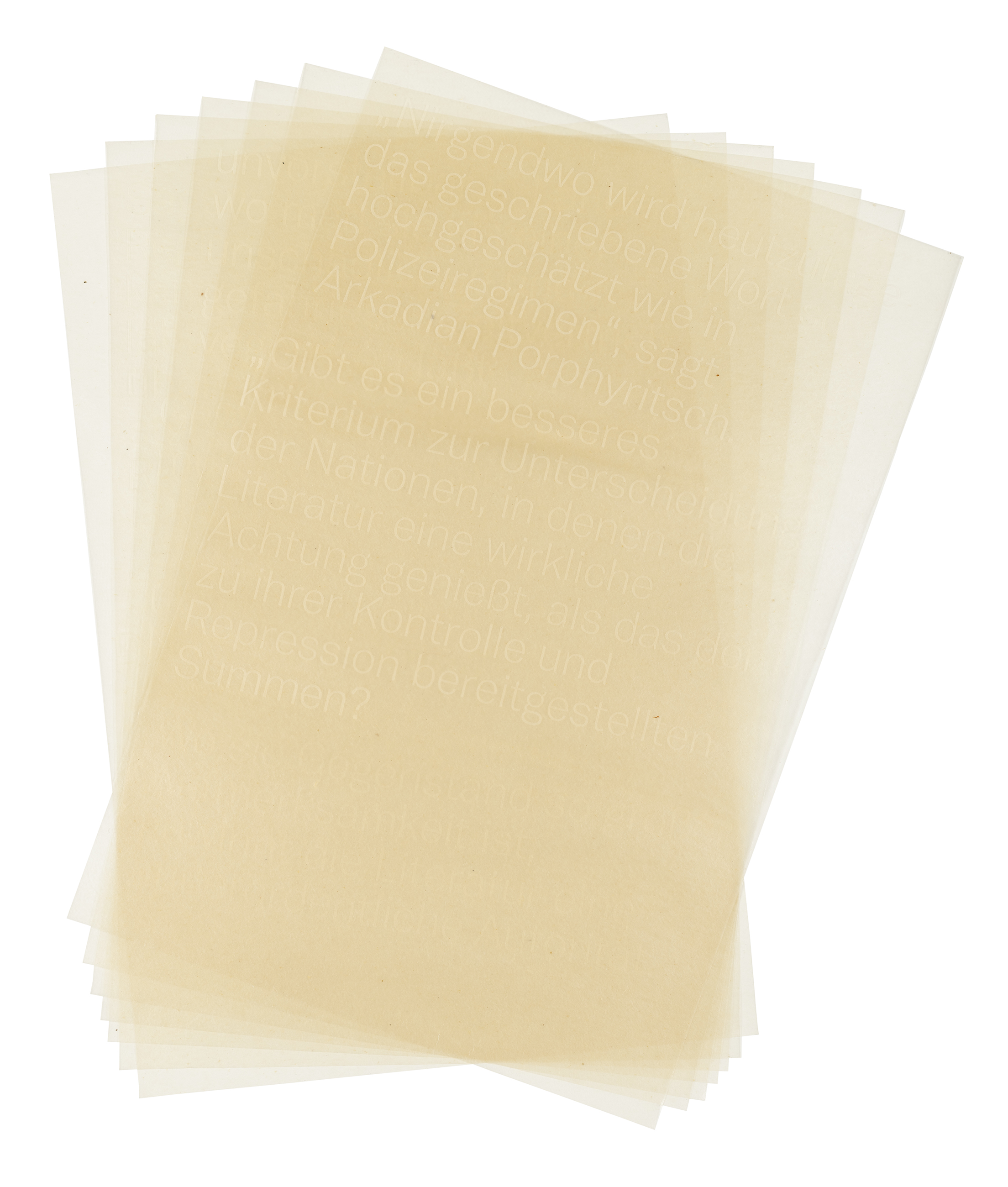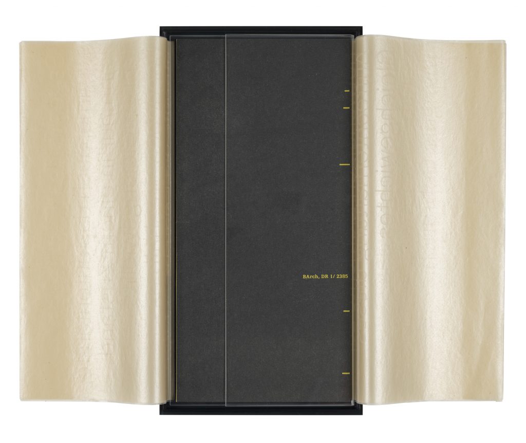Prophyritsch‘s praise of the repressive police state is embossed on a total of six thin, waxed papers, the transparent paper turning white at this point. This handmade material was originally used as a stencil for mimeography, a precursor to xerography. The mimeography stencil is representative of the many simple techniques writers and artists used to reproduce texts that had no chance of publication in the official publishing system of the GDR. The six sheets lie loosely around and cover a narrow booklet containing two expert assessments from the Federal Archives.