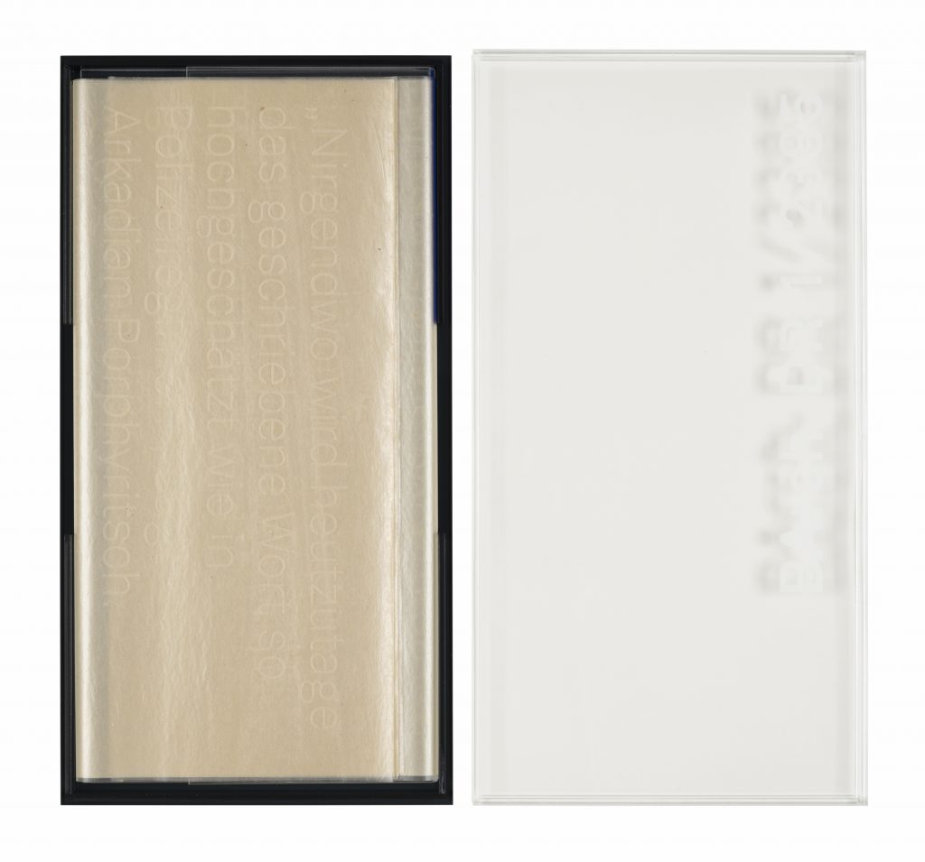 The gray cover with yellow embossing is reminiscent of a file veiled by the thin waxed papers with Calvino‘s quote critical of censorship. Both are kept in a multicolored acrylic box with the file number of the approval process as the title.