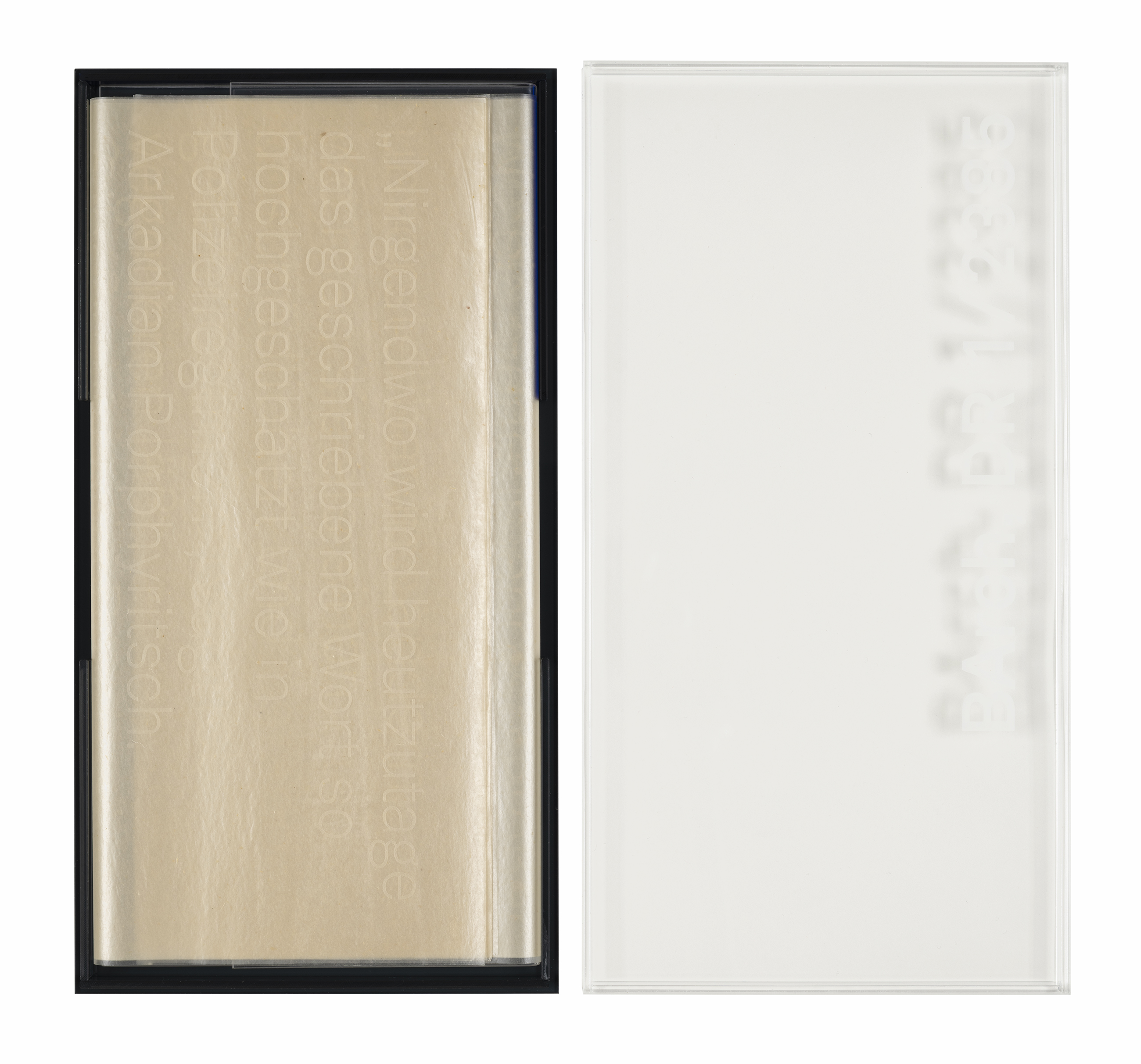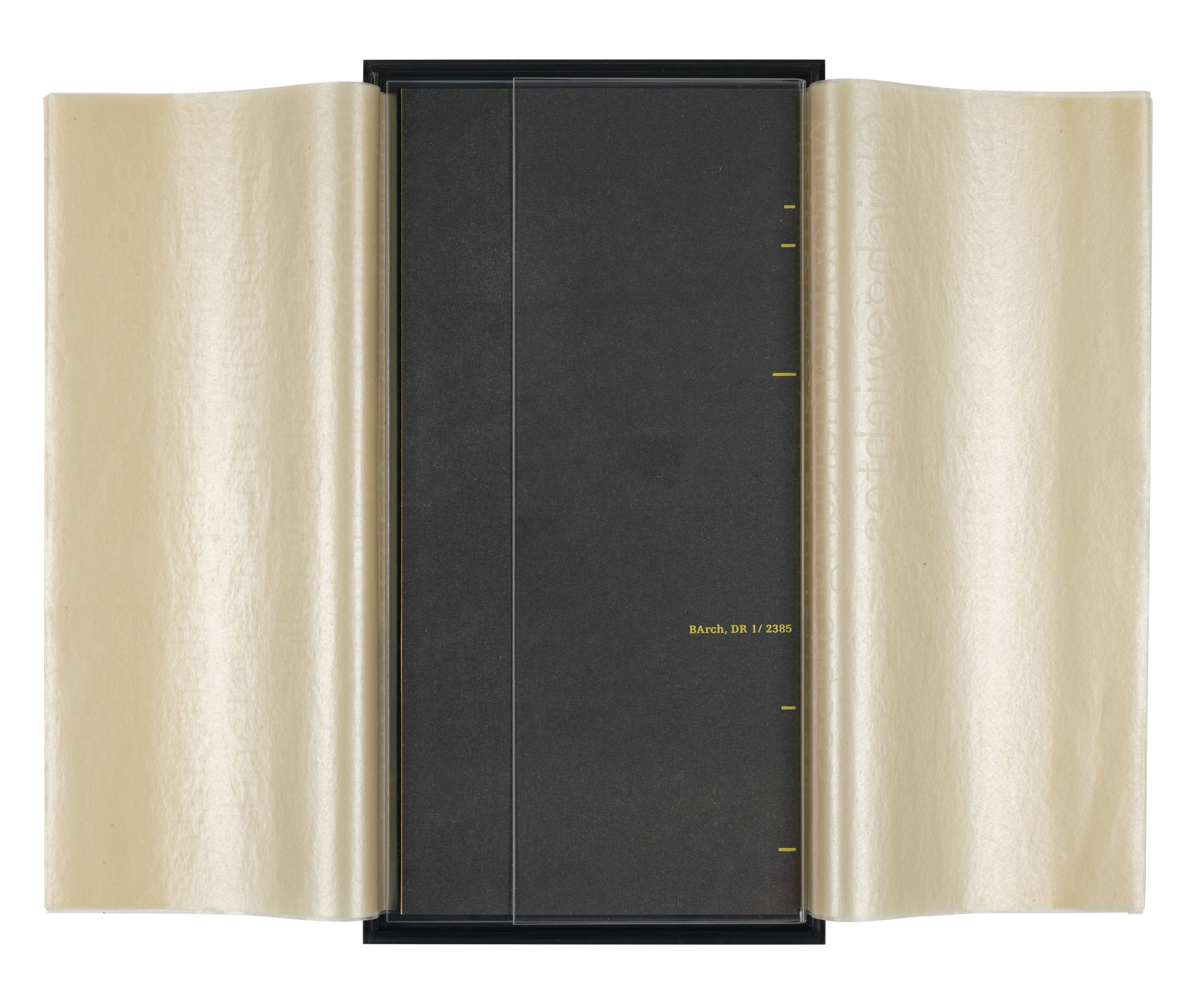 The two texts are printed on a handmade Mitsumata paper, which in its coloring and through small inclusions is reminiscent of the thin typewriter papers from GDR production. Underneath is another sheet with black block stripes, they indicate the constant threat of censorship.
