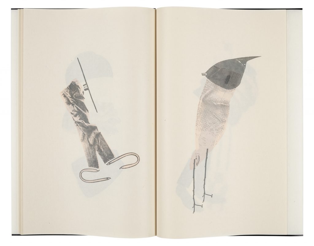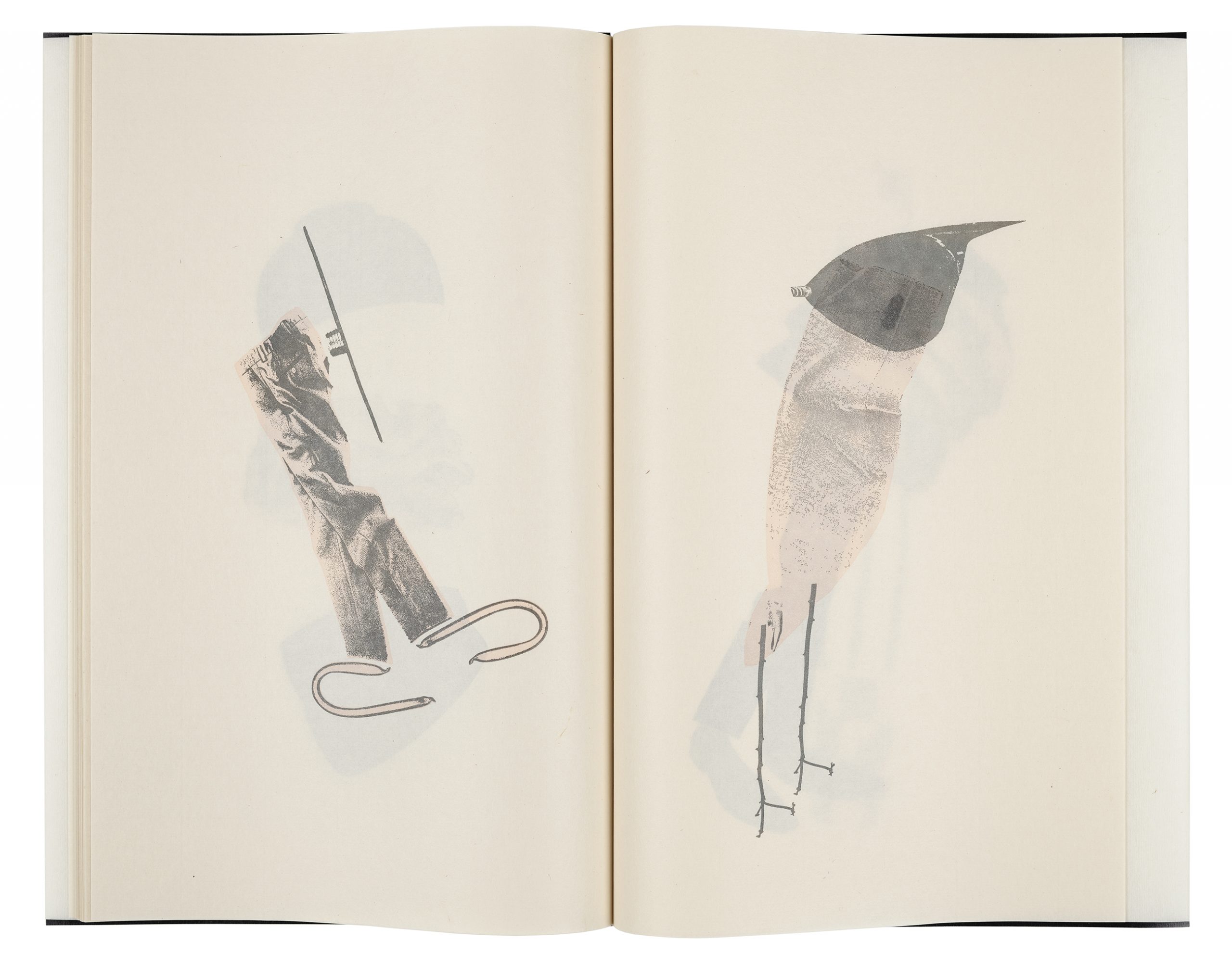 The same applies to the illustrations, ten collages of small or large objects, all of which are described in the original text. They are as faithful an image as possible of what I imagined while reading. The various objects were photographed and, without taking the proportions into account, I scaled them to the same format – similar to the non-proportional monospace font – and then cut them up and collaged them. As with the encrypted text, individual elements can be read, sometimes resulting in unusual and stimulating combinations, but without revealing the original story.