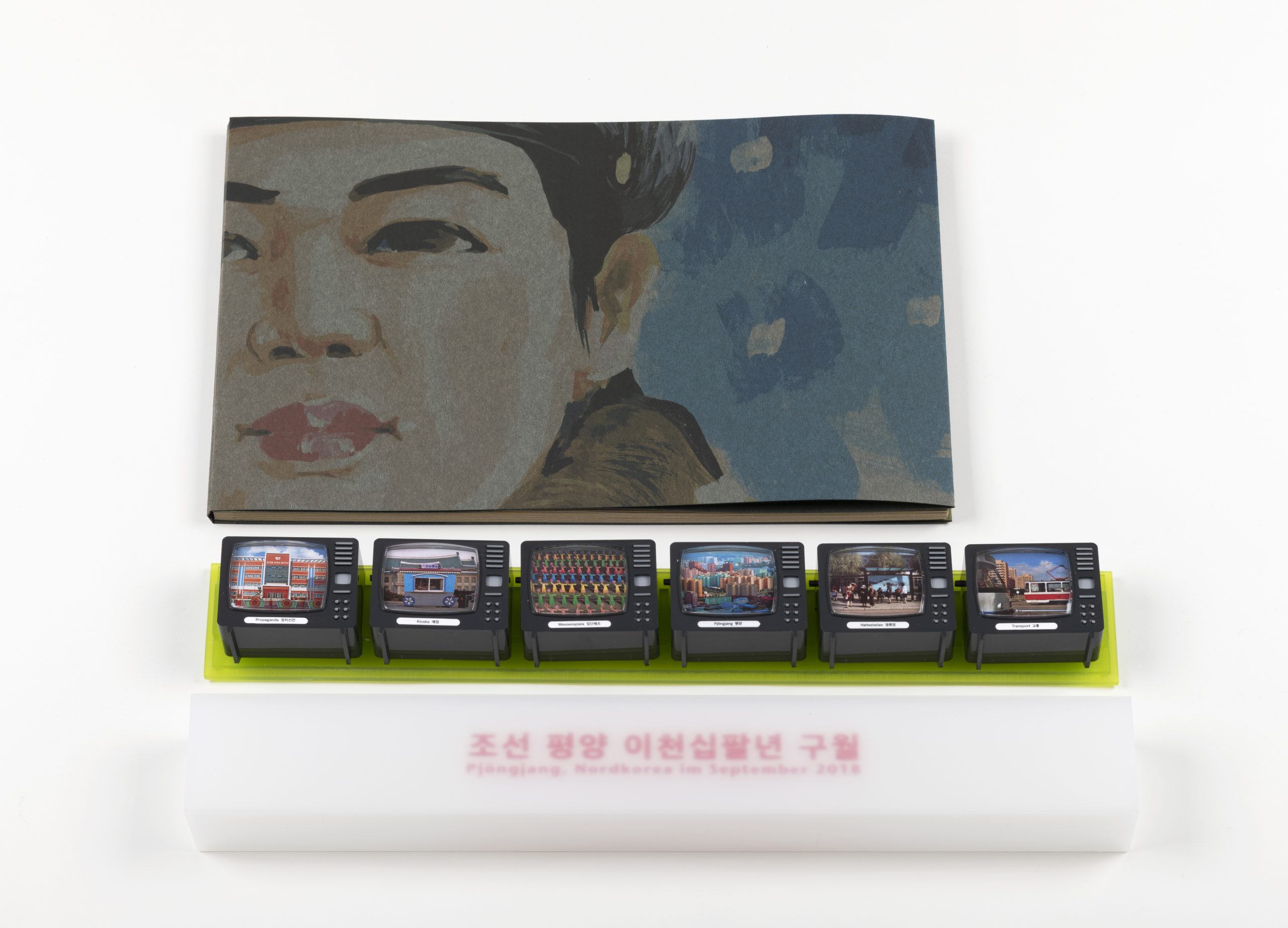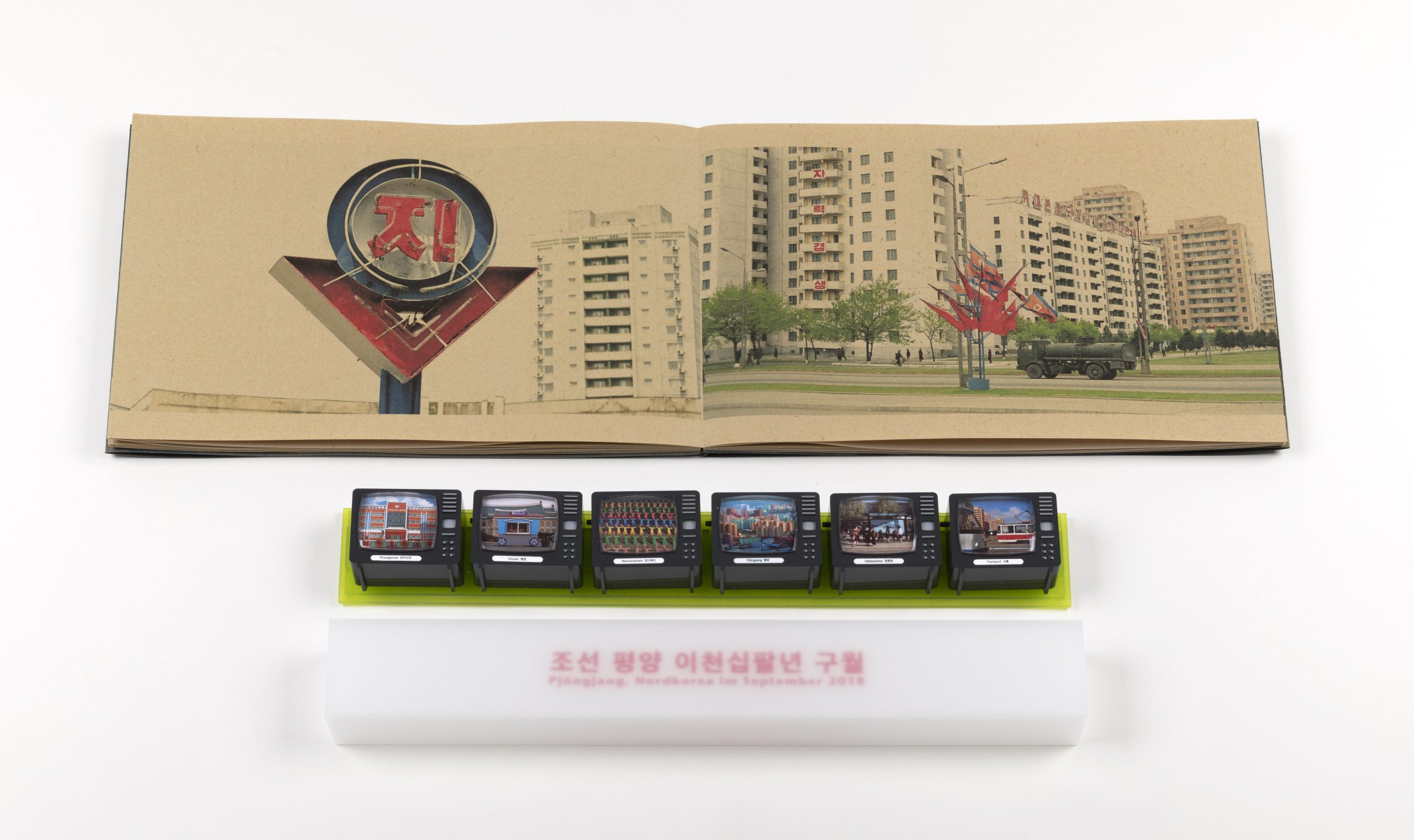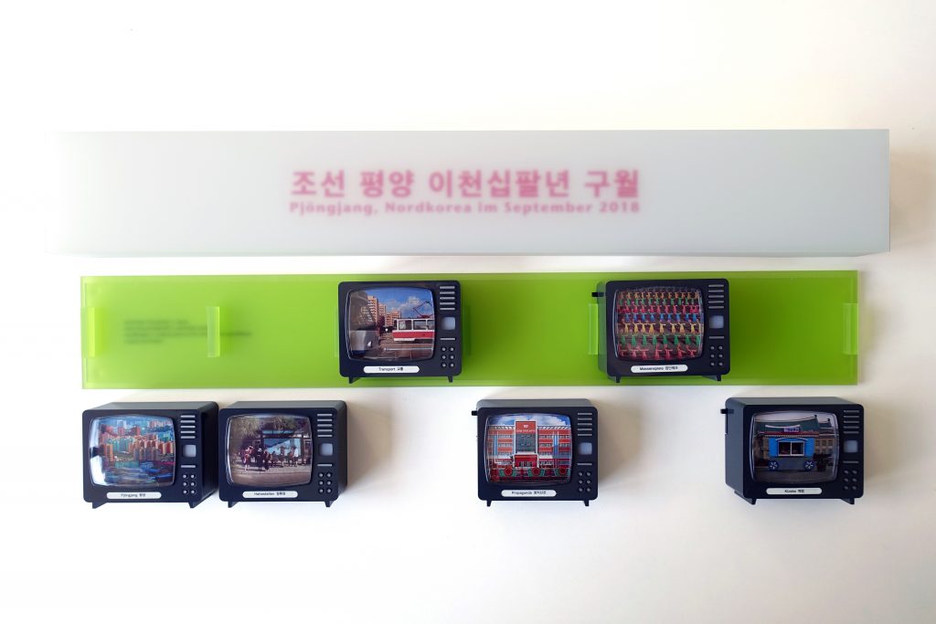 North Korea, May 2004: Inkjet print on Chinese bamboo paper, laminated withNorth Korea, September 2018: 6 picture viewers with 10 images each. Box made from white and green acrylic glass with screen printed title.