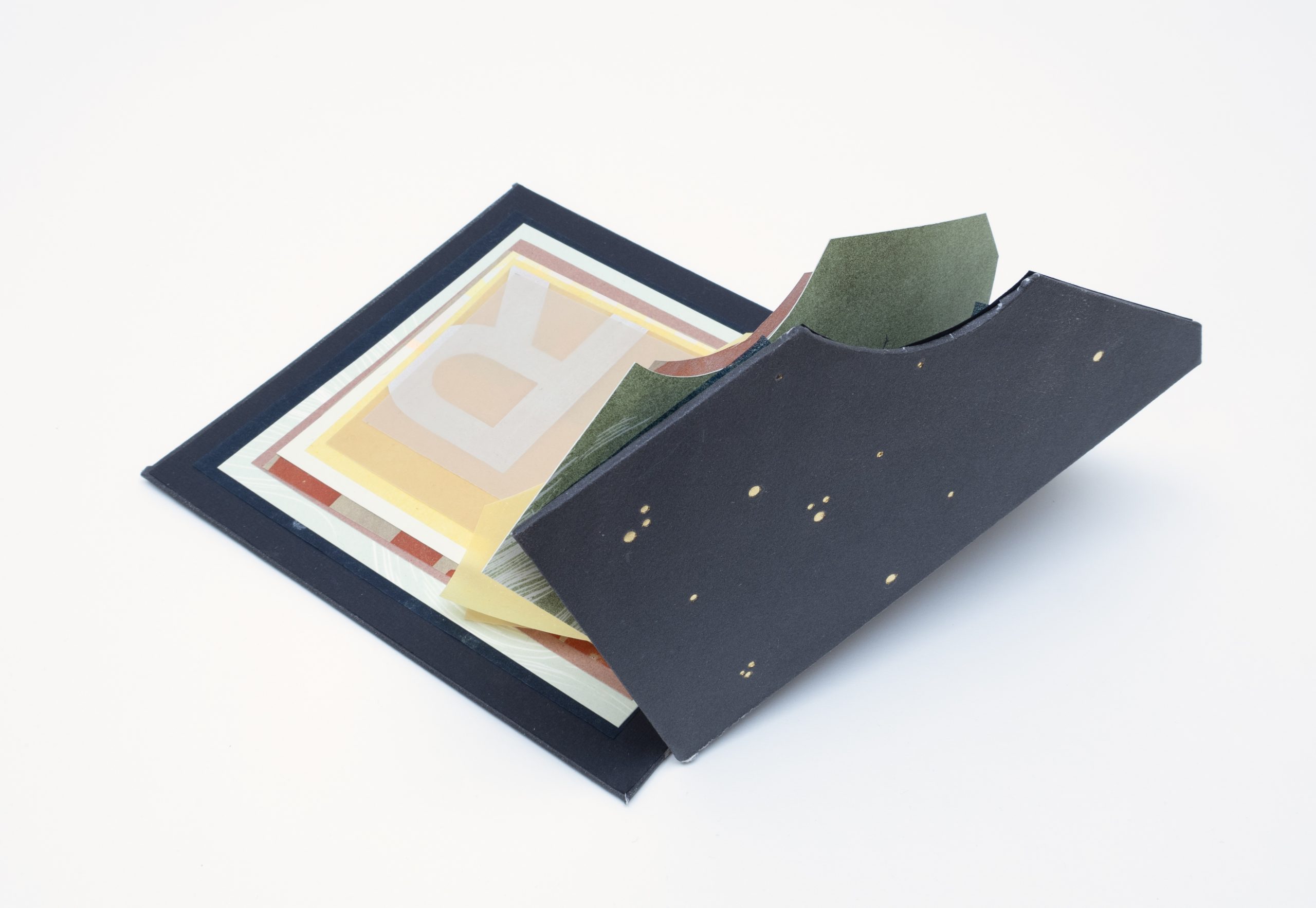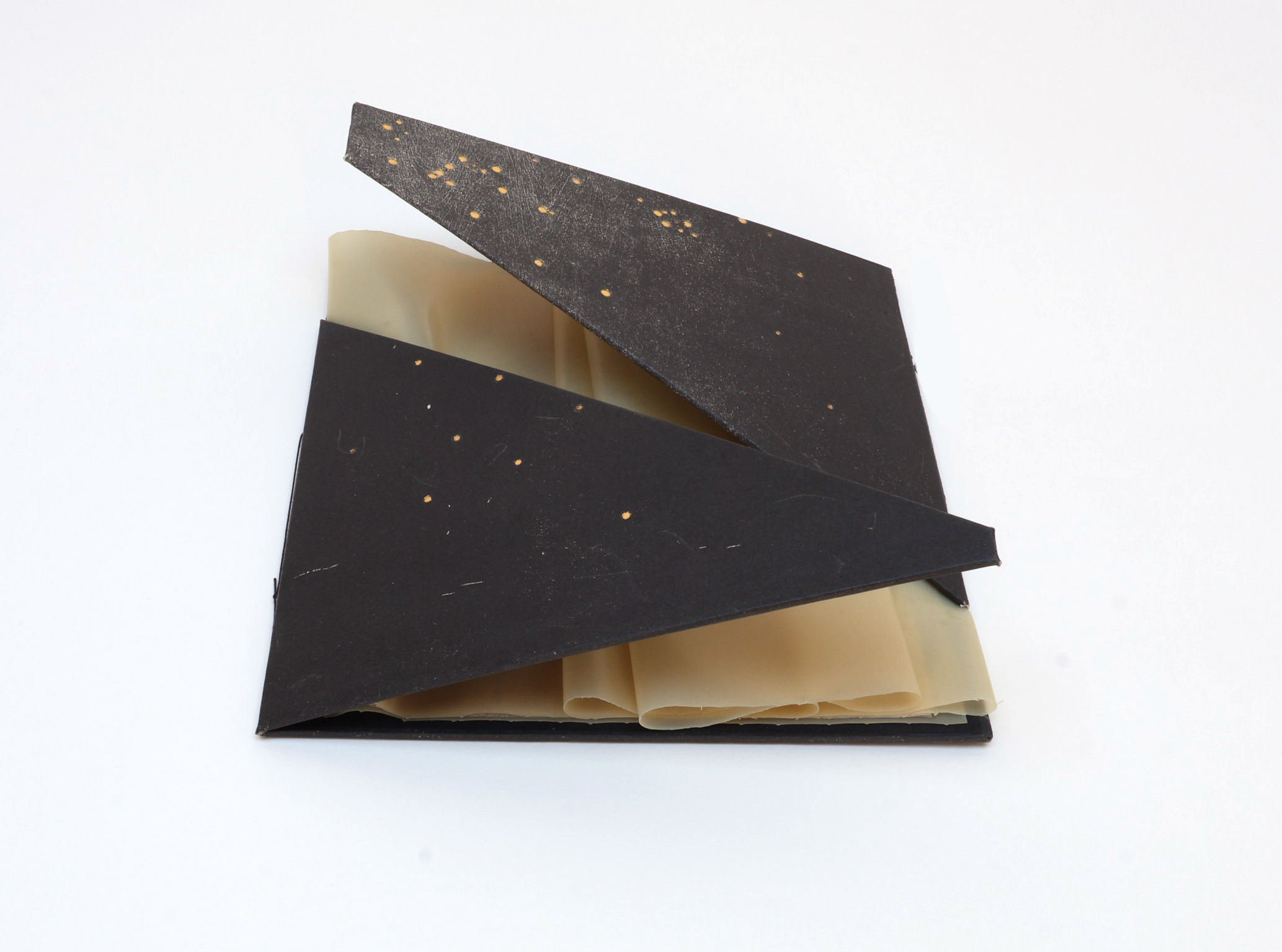 Letterpress, woodcut & hand bookbinding, printed on Japanese paper. Copper, latex and perspex, finished with gold tooling