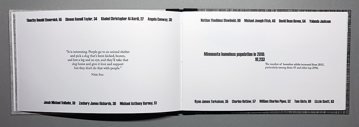 Quotations in the book juxtapose statements by people of privilege with those who experience the lack of compassion and even abuse by people enjoying more privilege. Statistics and statement about homelessness are from the 2018 Wilder Research Study on Homelessness.