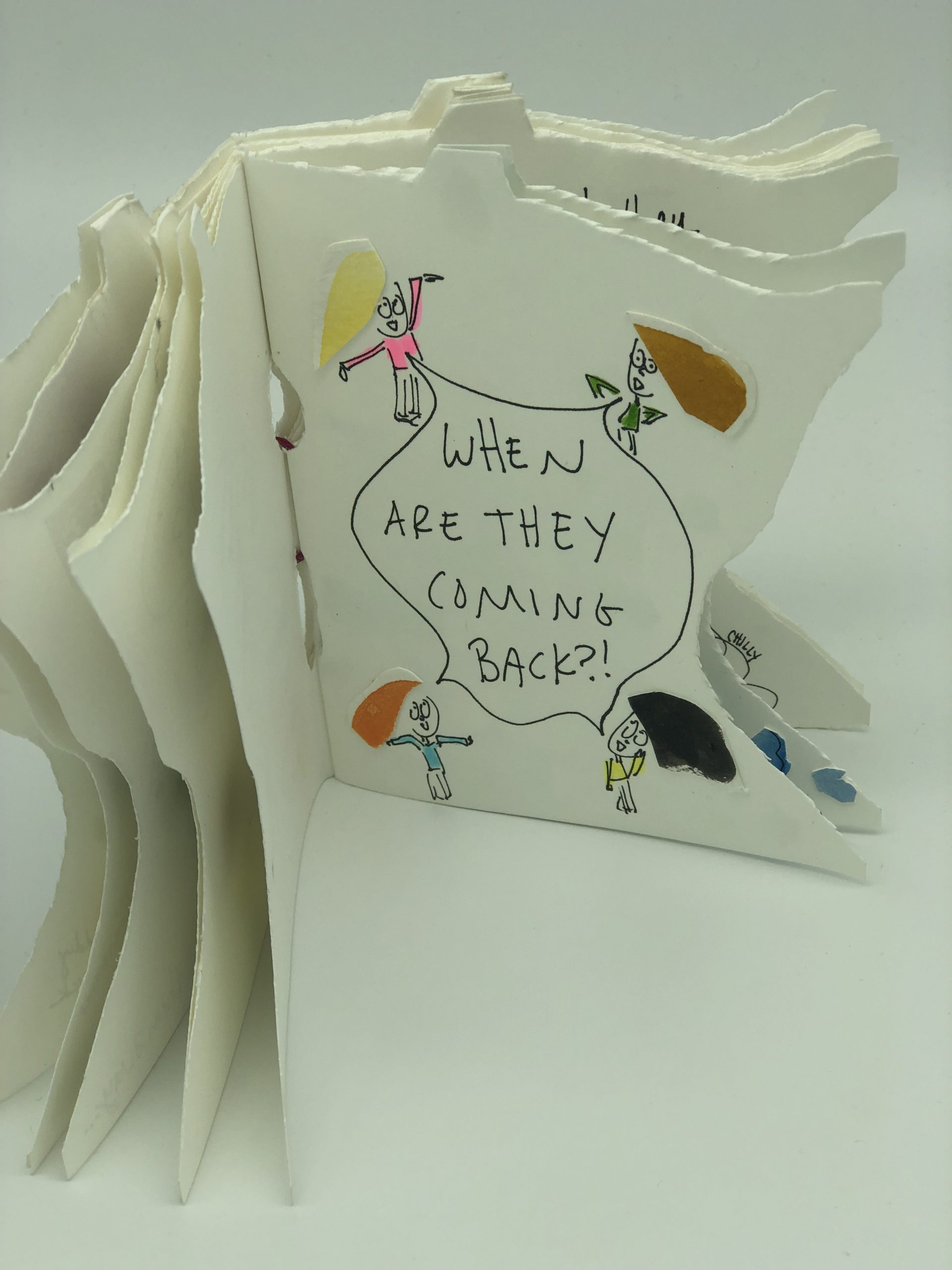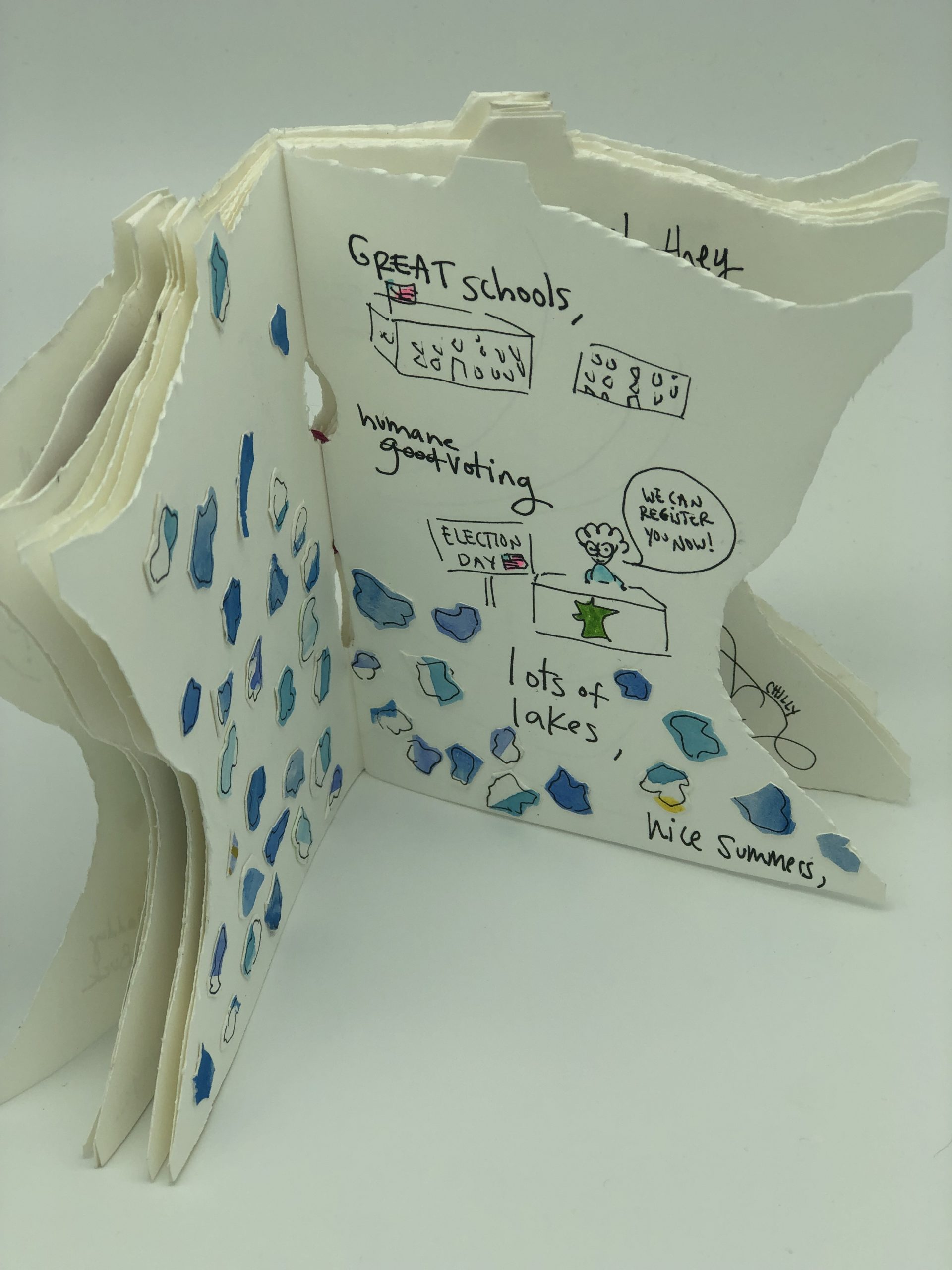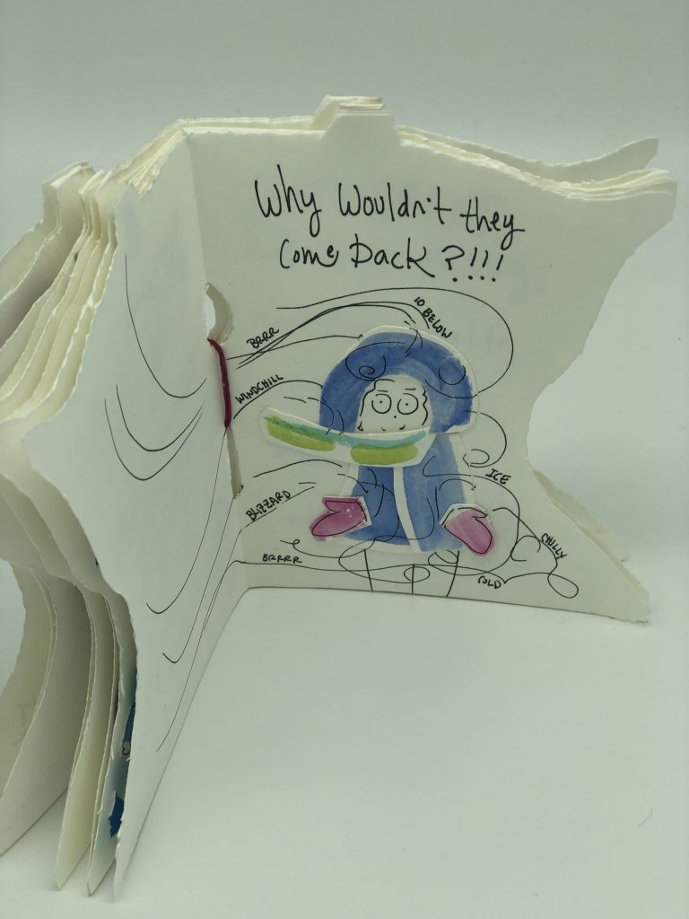 “When Are They Coming Back” is a book about being obsessed with a certain place, so much so that the obsession is pushed upon others. The form of the book emphasizes this, forcing the reader to acknowledge Minnesota, its boxy, pointy shape, with every page turn. Minnesota is not fly-over country, it is not a place to just “be from” and never return. It looks like a little hat, and this zine won’t let you forget it. And if it convinces you to move back home to the place that misses you most, this zine will have served its purpose.